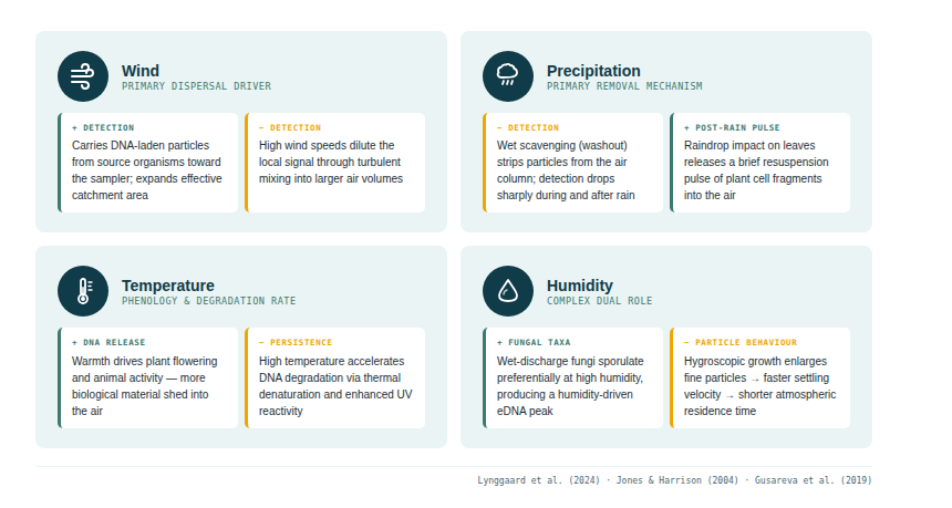 A third factor sits alongside these: organism activity. Animals move, shed DNA, and release faecal aerosols more intensively during warm, active periods. Plants flower and release pollen on temperature cues. Fungi discharge spores at specific humidity thresholds. The same meteorological variables that govern transport and degradation also govern how much DNA enters the air in the first place — amplifying or dampening the signal at source before it even begins to travel.