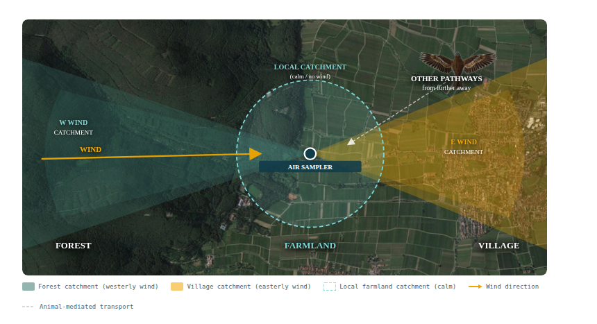 Wind direction determines the source region from which a sampler draws its DNA signal. On any given day, the sampler primarily captures organisms from the upwind sector. Sullivan et al. (2025) demonstrated this elegantly using HYSPLIT back-trajectory analysis, showing that the effective catchment of their Swedish radionuclide station was elongated in the direction of prevailing winds and shifted seasonally with large-scale atmospheric circulation.